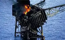 ![]() Piper Alpha on fire shortly after the second explosion | |
