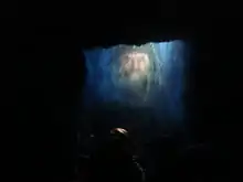 The guests' boat then takes a plunge down a waterfall into a dimly lit cavernous passage, where voices can be heard singing the theme song.