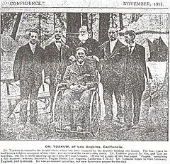 Other secular writers questioned Yoakum's faith healing practices. As early as 1903, Yoakum claimed his movement had performed some 800 healings, and the Los Angeles Times described Yoakum as the "leading apostle of the 'faith-healing' movement in this city."[11] However, the Times noted discrepancies in the dates and circumstances of the "healings" under the headline "Pouring Oil on the Sick ... Stories Don't Jibe."[11] In 1909, the Los Angeles Times published a lengthy article criticizing Yoakum's tactics. The article, titled "No Miracles Without Cash: Services Halt While Money Is Collected," described events at one of the healing services held at Pisgah Home.[20] The Times opened by quoting the Pisgah Home motto: "God loves a cheerful giver."[20] It then described a "Healing and Testimony of the Healed" service:
