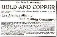 Though he began his mission around 1900, he continued to have other business interests as well. One of those interests was gold mining. In 1897, the Los Angeles Times published an article on Yoakum's claim that he had discovered a new method of "X-Ray Prospecting" for gold. Yoakum reported that he had laid a bit of gold-bearing quartz on the x-ray plate while taking an x-ray of a patient with a tumor. The x-ray showed the location of the gold deposits in the quartz, and Yoakum proposed using x-rays in mine tunnels to "ascertain decisively if gold is present, and if so, exactly where it lies and in what quantities."[4] Following this report, Yoakum became active in gold and copper mining.[5][6] In 1902, he ran a newspaper advertisement (pictured at left) offering stock at 25 cents a share in his new mining company.[7] Yoakum later claimed that it was while traveling in Mexico, the location of his mining interests, that he spoke for the first time in tongues. He reported: "I was in the heart of Mexico in a church, speaking through an interpreter to the Mexicans and Indians, when suddenly a distinct rush of some might wind came upon me, and when I opened my mouth it was not English, but a beautiful smooth Castilian language, and for 20 or 30 minutes I held that large audience."[8]