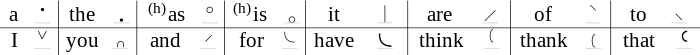 Common words are represented by special outlines called logograms (or "Short Forms" in Pitman's New Era). Words and phrases which have such forms are called grammalogues. Hundreds exist and only a tiny number are shown above. The shapes are written separately to show that they represent distinct words, but in common phrases ("you are", "thank you", etc.) two or three logograms may be joined together, or a final flick added to represent the.