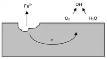 elsewhere outside the pit) developing on a metal immersed into an aqueous solution containing dissolved oxygen. Here, the pH conditions are neutral or alkaline (presence of OH−