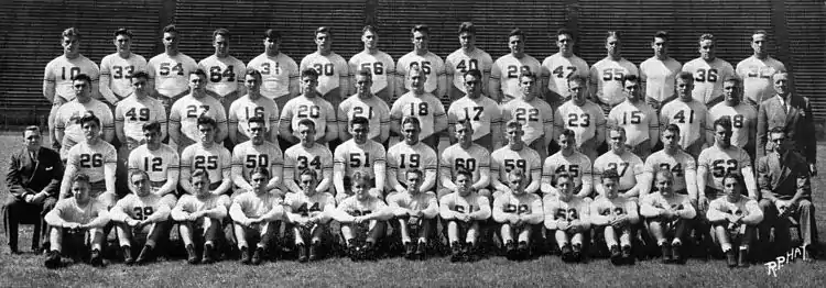 In 1914, Pitt athletic booster Joseph Trees and athletic director A. R. Hamilton hired Glenn Scobey "Pop" Warner as Pitt's head coach. Warner, who had previously led Carlisle, Cornell, and Georgia, had been successful at his previous stops, mentoring the likes of Jim Thorpe, and was known as an innovator of the game who originated the screen pass, single- and double-wing formations, and use of shoulder and thigh pads. His arrival at Pitt gave the program instant national credibility, lifting the perception of the program from a regional power to that of a national one.[29] Warner's impact was immediate. Led by center Robert Peck, Pitt's first First Team All-American, and All-American end James Pat Herron, Warner's first Pitt team in 1915 went 8–0, shutting out five opponents, and was trumpeted by football historian Parke H. Davis as that season's national champion.[30] His second season duplicated that success, repeating an 8–0 record while collectively outscoring opponents 255–25, and garnering what is widely regarded as a consensus national championship.[31] The lone scare of the 1916 season occurred at Navy when, following a delay of the team's train heading to Annapolis that caused a late arrival, the team overcame several fumbles and eked out a 20–19 victory.[32] The 1916 team was led again by Herron and Peck, now in his last season, as well as All-Americans fullback Andy Hastings and guard "Tiny" Thornhill. Also on that team were Jock Sutherland and H.C. "Doc" Carlson, who both would garner First Team All-American selections while members of the undefeated 1917 team, and go on to become perhaps Pitt's most legendary coaches in football and basketball, respectively. The 1917 team, nicknamed "The Fighting Dentists" because over half the roster became doctors or dentists, finished 10–0 with five shutouts despite losing several players to military service at the outbreak of World War I. The Spanish flu pandemic of 1918, which took the life of former Pitt star Tex Richards,[33] saw the implementation of quarantines that eliminated much of that year's college football season, including five of Pitt's originally scheduled contests. All of Pitt's games that year were played in November, including a high-profile game played as a War Charities benefit against undefeated, unscored upon, and defending national champion Georgia Tech, coached by the legendary John Heisman. Pitt swept through its first two games and then dismantled Georgia Tech 32–0 in front of many of the nation's top sports writers including Walter Camp. The final game of the season at Cleveland Naval Reserve resulted in Warner's first loss at Pitt and is one of the most controversial in school history. Warner, along with some reporters covering the game, insisted Pitt was robbed by the officials who, claiming the official timekeeper's watch was broken, arbitrarily ended the first half before Pitt was able to score and then allowed the Reserves extra time in the fourth quarter to pull ahead 10–9 before calling an end to the game.[34][35] Despite the loss, the 4–1 Panthers of 1918 were named by multiple selectors as a national champion for that season.[36]