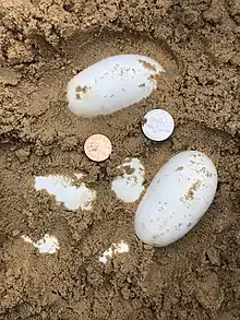 After mating has taken place in spring, clutches of three to 24 eggs are laid in June–August. The eggs are deposited in sandy burrows or under large rocks or logs and hatch after 64–79 days of incubation.[8] The eggs are adherent and quite large, up to 66 mm (2.6 in) long by 45 mm (1.8 in) wide. Hatchlings measure 33–45 cm (13–18 in).[6]