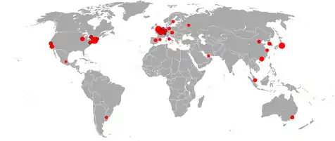 The practice is understood to have gained significance with the emergence of the post-industrial society among developing nations, in which places contend in an interdependent, increasingly-globalized economy.[5] Thus, place branding invariably relates to the notion that places compete with other places for people, resources, and business, and, as result, many public administrations pursue such strategies.[6][7][8] As of 2011, the global competition of cities is estimated to host at least 2.7 million small cities/towns, 3,000 large cities, and 455 metropolises,[9]