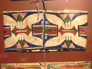 Buffalo robes and parfleches were frequently painted with geometrical patterns. Parfleches are rawhide envelopes for carrying and storing goods, including food. Their painted designs are thought to be stylized maps, featuring highly abstract geographic features such as rivers or mountains.[4]