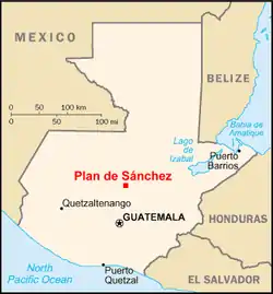 Plan de Sánchez is a village in the municipality of Rabinal, Baja Verapaz department, Guatemala. On July 18, 1982, while General Efraín Ríos Montt was President of Guatemala, a massacre was committed there by government forces during which over 200 people were killed. The massacre was a part of what is known as the scorched earth policy where the Guatemalan army eliminated up to 200,000 Mayan and indigenous peoples in a 36-year civil war until 1996. In 2000 President Alfonso Portillo admitted that the government was responsible for the massacre in the village.