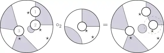 To compose two planar tangles, put the output disk of one into an input of the other, having as many intervals, same shading of marked intervals and such that the -marked intervals coincide. Finally we remove the coinciding circles. Note that two planar tangles can have zero, one or several possible compositions.