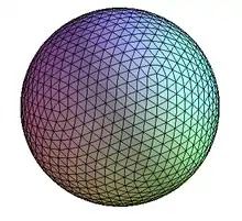 A polyhedron formed by replacing each of the faces of an icosahedron by a mesh of 100 triangles, an example of the lower bound construction of Djidjev (1982)