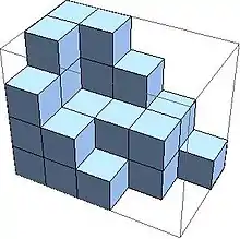 A plane partition may be represented visually by the placement of a stack of unit cubes above the point (i, j) in the plane, giving a three-dimensional solid as shown in the picture.