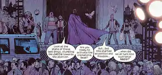 The final pages of the issue cut to 150 years into the future, where a "Phoenix Egg" is found on the moon by an astronaut, offering a segue into the final arc of Morrison's X-Men run, the future based "Here Comes Tomorrow".