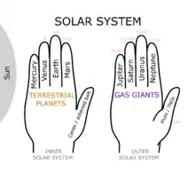 A planetary mnemonic refers to a phrase used to remember the planets and dwarf planets of the Solar System, with the order of words corresponding to increasing sidereal periods of the bodies. One simple visual mnemonic is to hold out both hands side-by-side with thumbs in the same direction. The fingers of hand with palm down represent the terrestrial planets where sun is next to pinkie "mercury" finger and its thumb represents asteroid belt, including Ceres. The other hand represents gas giants, the thumb representing Trans Neptunian objects, including Pluto.