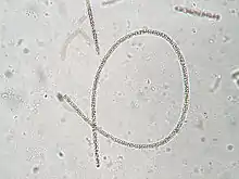 Planktothrix is a diverse genus of filamentous cyanobacteria observed to amass in algal blooms in water ecosystems across the globe. Like all Oscillatoriales, Planktothrix species have no heterocysts and no akinetes. Planktothrix are unique because they have trichomes and contain gas vacuoles unlike typical planktonic organisms.[1] Previously, some species of the taxon were grouped within the genus Oscillatoria, but recent work has defined Planktothrix as its own genus.[2] A tremendous body of work on Planktothrix ecology and physiology has been done by Anthony E. Walsby, and the 55.6 kb microcystin synthetase gene which gives these organisms the ability to synthesize toxins has been sequenced.[3] P. agardhii is an example of a type species of the genus.[4] P. agardhii and P. rubescens are commonly observed in lakes of the Northern Hemisphere where they are known producers of potent hepatotoxins called microcystins.[5]