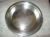 A plate is a broad, concave, but mainly flat vessel on which food can be served.[1] A plate can also be used for ceremonial or decorative purposes. Most plates are circular, but they may be any shape, or made of any water-resistant material. Generally plates are raised round the edges, either by a curving up, or a wider lip or raised portion. Vessels with no lip, especially if they have a more rounded profile, are likely to be considered as bowls or dishes, as are very large vessels with a plate shape. Plates are dishware, and tableware. Plates in wood, pottery and metal go back into antiquity in many cultures.