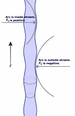 But the Young-Laplace equation is influenced by two separate radius components. In this case one is the radius, already discussed, of the stream itself. The other is the radius of curvature of the wave itself. The fitted arcs in the diagram show these at a peak and at a trough. Observe that the radius of curvature at the trough is, in fact, negative, meaning that, according to Young–Laplace, it actually decreases the pressure in the trough. Likewise the radius of curvature at the peak is positive and increases the pressure in that region. The effect of these components is opposite the effects of the radius of the stream itself.