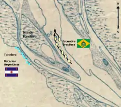 On 17 December 1851, a squadron of Brazilian ships, consisting of four steamships, three corvettes and one brig under the command of Grenfell, forced a passage of the Paraná River in the battle which became known as the Passage of the Tonelero. The Argentines had formed a powerful defensive line at The Tonelero Pass, near the cliffs of Acevedo, protected by 16 pieces of artillery and 2,000 riflemen under the command of general Lucio Norberto Mansilla.[67] The Argentine troops exchanged fire with the Brazilian warships but were unable to prevent them from progressing upriver.[69] The following day, the Brazilian ships returned and broke their way through the Tonelero's defences, carrying the remaining troops of Marques de Sousa's Brazilian division upstream towards Gualeguaichu. This second influx of ships caused Mansilla and his soldiers to withdraw in chaos, abandoning their artillery, believing that the Allies were intending to land and attack their positions from the rear.[70]