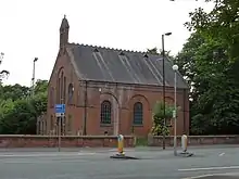 The chapel is on Wilmslow Road south of Grangethorpe Road; the present structure is a rebuilding of 1790, then modified in 1874-75. It was a family chapel of the Worsleys of Platt Hall built in 1699, and was constructed for Henry Finch, who had lost the use of the Birch Chapel where he had been installed by the Parliamentarian office Thomas Birch in 1672.[19][20] The congregation began as Independents (Congregationalists) and became Unitarian during the early 19th century. The ministers succeeding Finch were Robert Hesketh, John Whitaker, Robert Andrews, John Houghton, Richard Meanley, George Checkley (1797-1807), Joseph Lawton Siddall, William Whitelegge (1810–1865), Samuel Alfred Steinthal, and Charles Thomas Poynting.[21][22][23][24]
