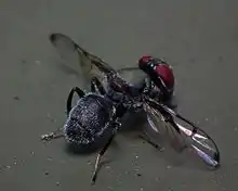 In males of Pogonortalis, the length and degree of development of hairs (setae) on the lower facial area, together with widening of the head, facilitates territorial dominance[6] by head-butting and rearing-up behaviours. Head-butting is taken to the extreme in the Australasian genus Achias,[7][8] in which species have the fronto-orbital plates expanded laterally to produce eyestalks.