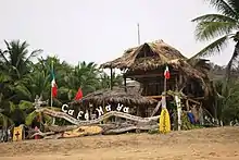 Zipolite is a nearly pristine beach about forty meters wide and two km long, with medium grain gold colored sand. The water is clear with tones of blue and green.[3] This was one of the beaches featured in the Mexican hit movie Y tu mamá también.[16] It stretches from a small isolate cove called Playa del Amor on the east side to the new age Shambala retreat on the west end which is partially sheltered by rocks. Behind this is, sea cliffs rise. The beach is lined by palm trees and rustic cabins, hotel rooms and hammocks with a few more sophisticated lodgings on the west end.[13][20] This beach is part of the Riviera Oaxaqueño, which includes the nearby beaches of Puerto Angel and San Agustinillo.[8] This beach is favored by foreign tourists, most of whom are backpackers and by the Mexican middle class,[2][3][16] especially during Holy Week vacation in Mexico.[6] and first weekend of February during the annual naturist festival, Festival Nudista Zipolite[21] organized by Federación Nudista de México[22] and the local hoteliers' association. The beach’s appeal stems from being one of very few beaches in which nudity is tolerated. Before it was mostly practiced on the sheltered far east Playa del Amor and the far west end, but recently the amount of nudists, also families with children, is growing also on the 'main' beach, probably thanks to some hotel owners becoming more open and flexible.[13][15][20] In 2016, the Pochutla municipality declared Playa Zipolite nudity legal.[23]