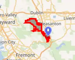 Pleasanton Ridge Regional Park is a 5,271-acre (21.33 km2) park in the East Bay Regional Park District overlooking Pleasanton, California and the Livermore Valley to the east. The park is scheduled to grow by almost 1,500 acres (6.1 km2)(sic) with the acquisition of the Tyler Ranch.[3]