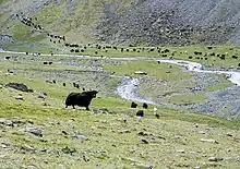 - Domestic yak (Bos mutus grunniens): Ten domestic yaks acquired in Irkutsk Oblast were introduced in Pleistocene Park in June 2017; two calves were born a few days after the arrival.[51] Another calf was born after that.[88] Yaks are adapted to extreme cold, short growing seasons for grazing herbage, and rough grazing conditions with sedges and shrubby plants. Wild yaks once lived in western Beringia. (Numbers in park in November 2021: approximately 8)[51][52][88]
