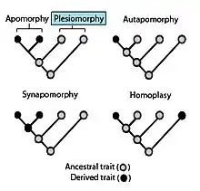 Plesiomorphy, symplesiomorphy, apomorphy, and synapomorphy, all mean a trait shared between species because they share an ancestral species.[lower-alpha 1]