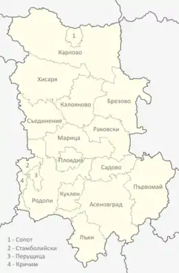 The province's capital is the city of Plovdiv; other towns include Karlovo, Sopot, Klisura, Kalofer, Hisarya, Saedinenie, Rakovski, Brezovo, Stamboliyski, Krichim, Perushtitsa, Sadovo, Parvomay, Asenovgrad, Laki, Katunica, and Yiagodovo.