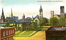 Under the leadership of Reverend A.L. Frisbie, 1871–1899, a new church was built in 1877 at the Northeast corner of 7th and Locust, this was Plymouth's first real church.[7] Pastor Frisbie and his wife Martha were both active in the anti-slavery and suffrage movements.[8] During his service as pastor, three groups went into the Des Moines community to form new congregations: Pilgrim, North Park and Greenwood churches. In 1900 the church planned a new grand building at Eighth and Pleasant Streets downtown. The church was built on what came to be known as "Piety Hill."[6] Parking became a problem at the downtown location as the church grew to 1300 members. Under pastor Frances VanHorn a new church was built at 8th and Pleasant Street.[9][10] An advertisement from 1909 mentions a sermon entitled "Lincoln's Religion, the religion of Jesus and Ours - for big hearted, broad minded folk."[11] During World War I a fourth neighborhood church, Waveland was started.