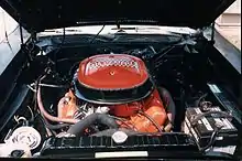 The standard engine was an exclusive "Roadrunner" 383 cu in (6.3 L) B-series V8 engine with a 4-barrel Carter Carburetor rated at 335 bhp (340 PS; 250 kW) at 5200 rpm and 425 lb⋅ft (576 N⋅m) at 3400 rpm of torque.[4] Its extra 5 hp (4 kW) rating was the result of using the radical cam from the 440 Super Commando and a .25 raise in compression to 10.5:1 (vs. 10.25:1 with the 330 hp (246 kW) 383). When air conditioning was ordered, the cars received the 330 hp (246 kW) version, because the radical cam specs of the 335 bhp (250 kW) version did not create enough vacuum to accommodate air conditioning. A $714 option was the 426 cu in (7.0 L) Hemi with 2X4 Carter AFB carburetors rated at 425 bhp (431 PS; 317 kW) at 5000 rpm and 490 lb⋅ft (664 N⋅m) at 4000 rpm of torque.[5]