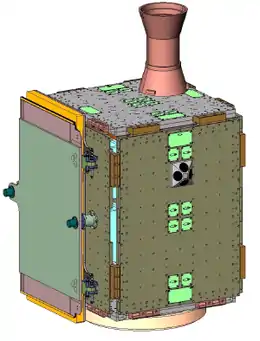 The design of the spacecraft centers on the idea of "smart" structural panels which are sealed aluminum panels which contain the necessary power and data electronics and harnessing.[3] Components mounted on these panels are limited to devices which are too large to be contained inside a panel and payload devices.