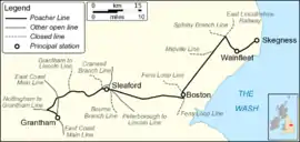 The Grantham–Skegness line, originally promoted as the "Poacher Line", runs for 55 miles (89 km) between Grantham and Skegness in Lincolnshire, England. Trains on this route originate from Nottingham via the Nottingham to Grantham Line as an hourly through service from Nottingham to Skegness, with slower stopping services at peak times. The line is operated by East Midlands Railway British Rail Class 156 "Super-Sprinter", British Rail Class 170 "Turbostar" and British Rail Class 158 "Sprinter Express" diesel multiple units.