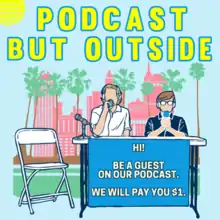 Podcast But Outside is a Los Angeles-based comedy video podcast started in April 2019 by co-hosts Andrew Michaan and Cole Hersch.[1] The title refers to the setting of the podcast, taking place in public often in the streets of greater Los Angeles.[2] The show seeks to interview random passersby, sometimes alongside invited special guests. A videographer, referred to as "Intern,"[3] records the interviews, made available on YouTube and, for premium content, Patreon.[4] In 2019, Vulture.com awarded the show with best video podcast among comedy podcasts.[5] According to its hosts, it is the only podcast recorded outside.[6]