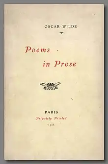 Poems in Prose is the collective title of six prose poems published by Oscar Wilde in The Fortnightly Review (July 1894).[1] Derived from Wilde's many oral tales, these prose poems are the only six that were published by Wilde in his lifetime, and they include (in order of appearance): "The Artist," "The Doer of Good", "The Disciple," "The Master," "The House of Judgment," and "The Teacher of Wisdom." Two of these prose poems, "The House of Judgment" and "The Disciple," appeared earlier in The Spirit Lamp, an Oxford undergraduate magazine, on 17 February and 6 June 1893 respectively. A set of illustrations for the prose poems was completed by Wilde's friend and frequent illustrator, Charles Ricketts, who never published the pen-and-ink drawings in his lifetime.