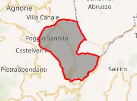 Poggio Sannita is a comune (municipality) in the Province of Isernia in the Italian region Molise, located about 30 kilometres (19 mi) northwest of Campobasso and about 25 kilometres (16 mi) northeast of Isernia. Poggio Sannita (Caccavone in Poggese) is on a promontory surrounded by the Verrino and Sente rivers,[3] (tributaries of the Trigno river) both mostly torrential in character, especially the latter, which dries up completely during the summer.
