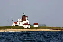The Point Judith Light is located on the west side of the entrance to Narragansett Bay, Rhode Island as well as the north side of the eastern entrance to Block Island Sound.[2][3][4] The confluence of two waterways make this area busy with water traffic and the waters around Point Judith are very cold and dangerous. Historically, even with active lighthouses, there have been many shipwrecks off these coasts.