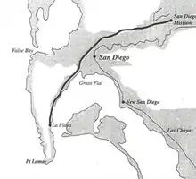 More than 200 years were to pass before a permanent European settlement was established in San Diego in 1769. Mission San Diego itself was in the San Diego River valley, but its port was a bayside beach in Point Loma called La Playa (Spanish for beach). The historic La Playa Trail, the oldest European trail on the West Coast,[9] led from the Mission and Presidio to La Playa, where ships anchored and unloaded their cargoes via small boats. Part of the route became present-day Rosecrans Street.[10] In his book Two Years Before the Mast, Richard Henry Dana Jr. describes how sailors in the 1830s camped on the beach at La Playa, accumulated cattle hides for export, and hunted for wood and jackrabbits in the hills of Point Loma.[11] The beach at La Playa continued to serve as San Diego's "port" until the establishment of New Town (current downtown) in the 1870s.