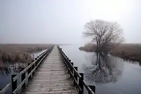 Point Pelee has a humid continental climate (Dfa under the Köppen climate classification) with warm, humid summers, and cold winters that is modified by the surrounding waters of Lake Erie.[3] It lies in a zone that is characterized by variable weather due to conflict between polar and tropical air masses.[19] Its position in Lake Erie modifies its climate, resulting in warmer winter and fall temperatures compared to inland regions, as the lake cools more slowly than the surrounding land though during the spring, temperatures remain cooler than inland areas due to the land warming faster than the lake.[19]