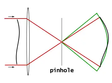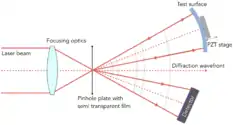 A point diffraction interferometer (PDI)[1][2][3] is a type of common-path interferometer. Unlike an amplitude-splitting interferometer, such as a Michelson interferometer, which separates out an unaberrated beam and interferes this with the test beam, a common-path interferometer generates its own reference beam. In PDI systems, the test and reference beams travel the same or almost the same path. This design makes the PDI extremely useful when environmental isolation is not possible or a reduction in the number of precision optics is required. The reference beam is created from a portion of the test beam by diffraction from a small pinhole in a semitransparent coating.[4][5] The principle of a PDI is shown in Figure 1.