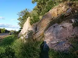 Point of Rocks is located along the east side of a curve in US 12, 0.25 miles (0.40 km) south of its intersection with Wisconsin Highway 159. The outcropping itself is around 4,000 feet (1,200 m) thick and consists of maroon, pink, and purple quartzite, while the surrounding area is covered by trees. The formation was created roughly 1.7 billion years ago and, as part of the Baraboo Range, is a remnant of a Precambrian mountain range. The rocks feature ripple patterns created by waves and tides, indicating that the surrounding area was once flooded by a sea. Geological concepts exhibited by the outcropping include stratification and structural deformation; the formation is often used as an illustrative example of the latter for geology students.[2]