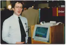 In 1986, Eugene "Gene" Mosher introduced the first graphical point of sale software[7] featuring a touchscreen interface under the ViewTouch[8] trademark on the 16-bit Atari 520ST color computer.[9] It featured a color touchscreen widget-driven interface that allowed configuration of widgets representing menu items without low level programming.[10] The ViewTouch point of sale software was first demonstrated in public at Fall Comdex, 1986,[11] in Las Vegas Nevada to large crowds visiting the Atari Computer booth. This was the first commercially available POS system with a widget-driven color graphic touch screen interface and was installed in several restaurants in the US and Canada.
