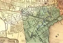 The area straddled the Montreal city limit, and the part outside was set up as the village of Saint-Gabriel in 1874 and annexed to Montreal in 1887, becoming a city ward.[3] In the early 20th century, Pointe-Saint-Charles was made up of two city wards: St. Gabriel, to the west, and St. Ann, to the east, which also included Griffintown and extended as far as McGill Street in what is now Old Montreal. The two were divided by the former city limit line, passing from the basin on the Lachine Canal just west of the St. Gabriel Locks to the riverbank just south of what is now the end of Ash Avenue.[8]