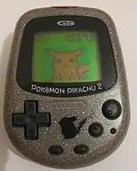 The second release, Pokémon Pikachu 2 GS, is available in clear and silver casing with a color display featuring more animations.[6] It features an infrared port for interacting with Pokémon Gold, Silver, and Crystal via the Mystery Gift option, which utilizes the Game Boy Color's built-in infrared communication port. This allows players to trade watts for items in the Game Boy games. Although there is a limitation on how much the Mystery Gift mode can be used between Game Boy cartridges, Pokémon Pikachu's only limit is that of available watts (and it is region locked). Watts can also be sent to other Pokémon Pikachu 2 units.[7]