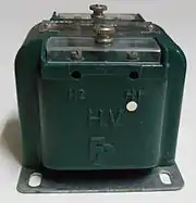 Transformers are said to have "additive" or "subtractive" polarity based on their physical arrangement of terminals and the polarity of windings connected to the terminals. The convention used for North American transformers is that, facing the high voltage side of the transformer, the H1 terminal is on the observer's right. A transformer is called "additive" if, conceptually, connecting the high-voltage terminal to the adjacent low-voltage terminal gives a total voltage between the other two terminals that is the sum of the high voltage and low voltage ratings, when the high-voltage winding is excited at rated voltage. The H1 and X2 terminals are physically adjacent. In the "subtractive" arrangement, the H1 and X1 terminals are adjacent, and the voltage measured between H2 and X2 would be the difference of the high voltage and low voltage windings.[3] Pole mounted distribution transformers are manufactured with additive polarity, while instrument transformers are made with subtractive polarity. Where markings have been obscured or are suspect, a test can be made by interconnecting the windings and exciting the transformer, and measuring the voltages.[4]