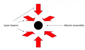 The atomic temperature can be measured using the time of flight (ToF) technique. In this technique, the laser beams are suddenly turned off and the atomic ensemble is allowed to expand. After a set time delay t, a probe beam is turned on to image the ensemble and obtain the spatial extent of the ensemble at time t. By imaging the ensemble at several time delays, the rate of expansion is found. By measuring the rate of expansion of the ensemble the velocity distribution is measured and from this, the temperature is inferred.[1][10]