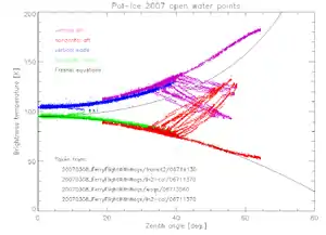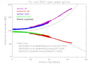 To test the calibration of the EMIRAD II radiometer[3] used in the Pol-Ice campaign, measurements over open water were compared with model results based on the Fresnel equations.[2] The first plot, which compares the measured data with the model, shows that vertically polarized channel is too high, but more importantly in this context, are the smeared points in between the otherwise relatively clean function for measured vertical and horizontal brightness temperature as a function of viewing angle. These are the result of polarization mixing caused by changes in the attitude of the aircraft, particularly the roll angle. Since there are plenty of data points, rather than correcting the bad data, the authors simply exclude points for which the angle, , is too large. The result is shown at far right.