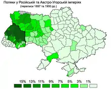 Due to assimilation, whereas at the time of the annexation of Ukrainian lands by Russia in 1795 10% of the population were Poles,[15] in spite of ongoing migration of Poles from central Poland into Ukrainian lands,[10] by the end of the nineteenth century only three percent of the total population of these territories reported that Polish was their first language.[15]