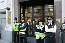 Two PCSOs (right) of the City of London Police with two Police Constables keeping order during a protest outside The Church of Scientology in London. Note the distinctive unique red bands and badging on the PCSOs headgear.