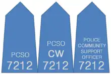 Most PCSOs tend to wear blue epaulettes on their shoulders, although some forces use black epaulettes. Since 2009 a few forces began embroidering names on to epaulettes.[43][44][45] PCSOs are issued with hi-visibility jackets and waterproof coats of varying design depending on the force. Officers may also be issued with a simple tabard for traffic duties. PCSOs wear nylon duty belts with quick release buckles to hold their equipment in pouches.