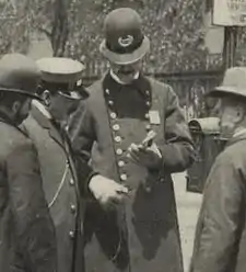 Centralized, municipally-managed police departments were unknown in the United States prior to the 1830s. Early law enforcement functions were largely performed by volunteer watchmen as well as elected or appointed constables and sheriffs, who were paid by the fee system for warrants they served.[1] The advent of professional police forces in the United States foreshadowed the introduction of standardized police uniforms. While uniforms for police had been introduced in the United Kingdom as early as 1828, adoption of standardized dress in the United States took longer, with many of the new police objecting to uniforms out of concern they would be subject to public ridicule.[2] Nonetheless, in 1854, the New York City Police Department became the United States' first municipal police force to issue uniforms to its officers. New York City was followed, in 1858, by Boston, Chicago, and soon thereafter, other cities.[3]