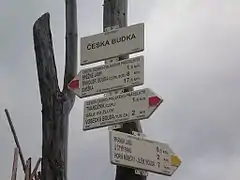 The Polish–Czech Friendship Trail (Czech: Cesta česko-polského přátelství, Polish: Droga Przyjaźni Polsko-Czeskiej) is a public walking path in the Karkonosze Mountains (Giant Mountains). The path runs on both sides of the Czech–Polish border, along the main ridge and crosses or traverses all its summits. The maintenance of the trail is performed by the staff of both adjacent national parks: the Polish Karkonosze National Park and the Czech Krkonoše National Park. The trail is marked red and the signs mostly bilingual. The start point is located on Szrenica and the end in the Okraj Pass/Pomezní boudy; the length of the trail is approx. 30 km; the level of difficulty is moderate. The trail partially overlaps with ski trails.